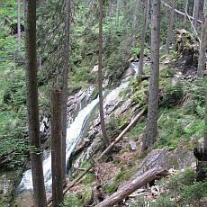 Podle turistického značení jsme měli vrchol Ostrého zdolat po sedmi kilometrech. Šli jsme po modré turistické značce podél Bílého potoka. Po čtyřech kilometrech jsme došli na rozcestí Pod Statečkem. Zde jsme měli možnost pokračovat směrem na Ostrý nebo odbočit z trasy a navštívit největší vodopády v naší vlasti a jediné na Šumavě, s romantickým názvem Bílá strž. Zvolili jsme vodopády. Cesta k nim prudce klesala. Až k vodopádům jsme se nedostali, ale přesto scenérie byla pěkná. Vodopády padají z výšky 17 metrů. Škoda jen, že jsme zde byli v období velkého sucha a průtok vody byl poměrně slabý.